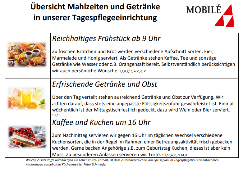 Das Tagespflegehaus bietet täglich drei Mahlzeiten an: Frühstück, Mittagessen und nachmittags Kaffee. Mit einem vielseitigen Frühstück beginnt der Tag. Die Gäste werden mit einem fertigen Frühstückstisch empfangen. Kaffee und Tee werden als Getränke angeboten, im Wechsel gibt es Brot und Toast oder Brötchen. Aufschnitt, Käse und selbstgemachte Marmelade werden angeboten. Eier in verschiedenen Zubereitungsformen werden als Ergänzung sporadisch gereicht. Fette werden eingespart durch halbfette Butter und Vollmilch im Kaffee. Mit Ruhe und Muße wird gegessen, der Tagesverlauf erörtert, die Tageszeitung vorgelesen, das Datum, der Tag, das Wetter und die Besonderheiten erläutert. Jederzeit stehen Obst und Getränke für die Gäste bereit.