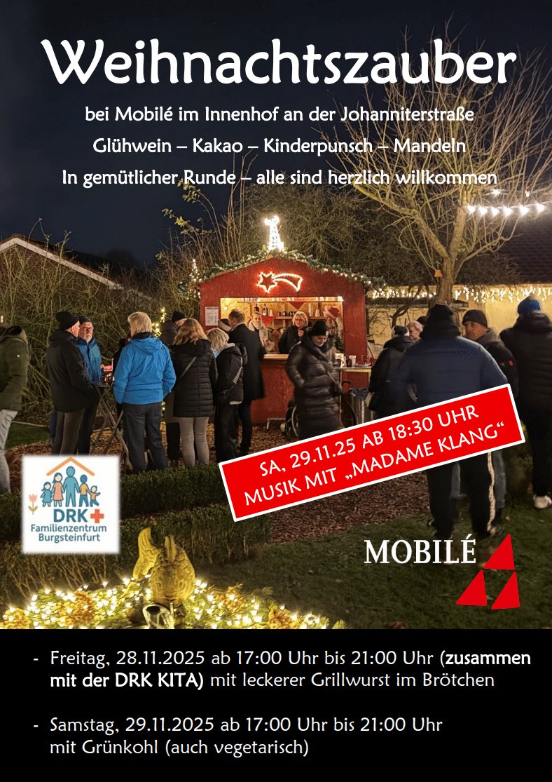 Am Freitag, 28.11 und Samtag, 29.11.2025 laden wir euch herzlich zu unserem kleinen, aber feinen Weihnachtsmarkt – dem Mobilé Weihnachtszauber – ein. Taucht ein in eine festliche Atmosphäre und genießt die zauberhafte Stimmung bei leckerem Glühwein, warmen Kakao und fruchtigem Kinderpunsch. Für den kleinen Hunger zwischendurch bieten wir köstliche Leckereien an.